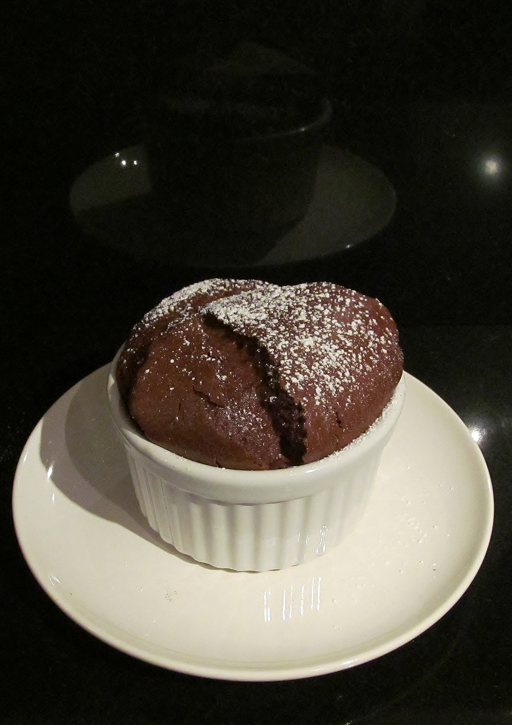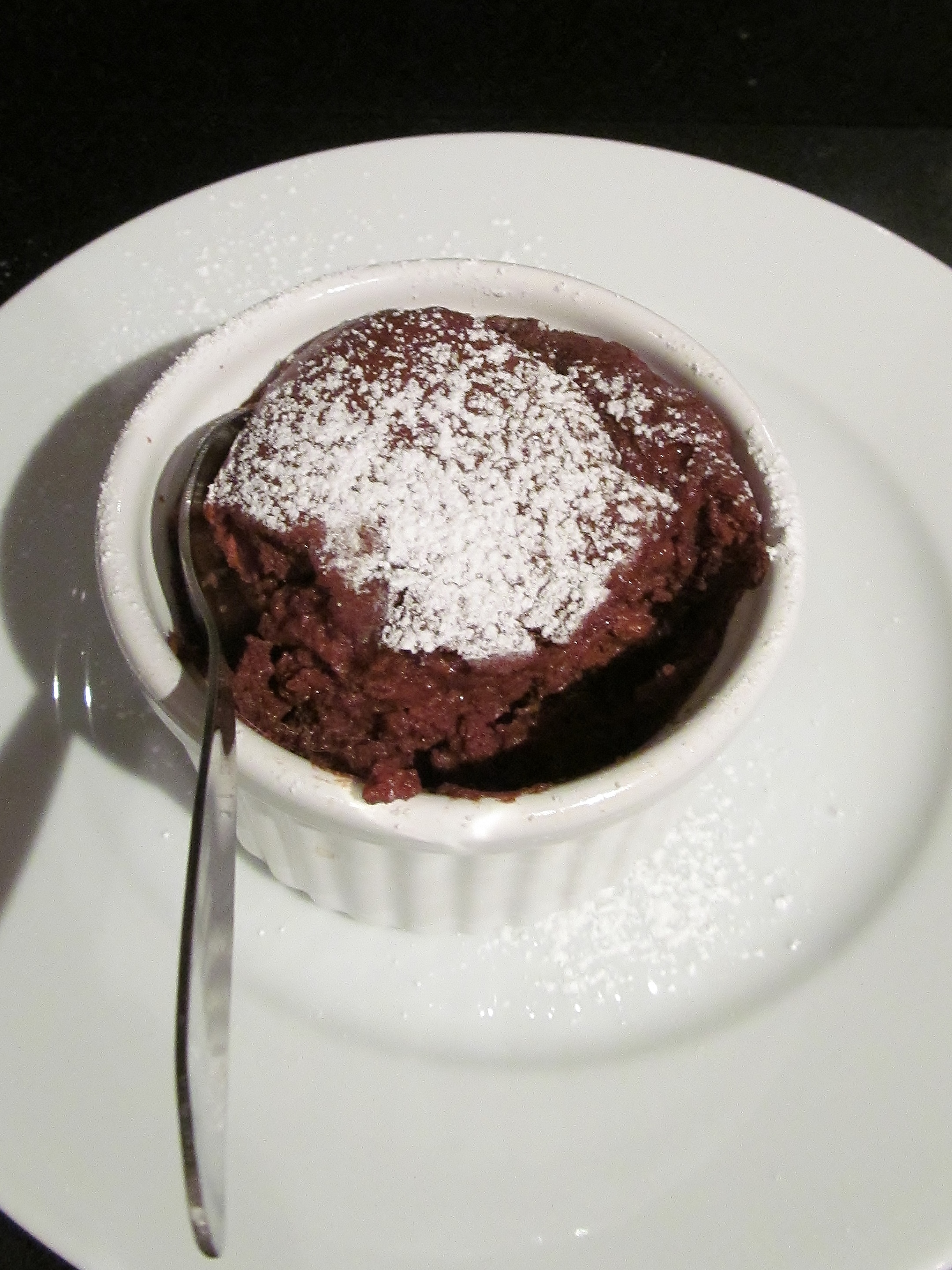In another pan, I melted some butter and stirred in the flour, cooked on a low heat for a short while and then stirred in the chocolate milk, brought it to the boil until thickened and then left it to cool. Finally I beat the egg yolks into the cooled mix, added the sugar, whisked the egg whites and folded this into the mix. Finally, I poured the mix between the souffle dishes and put them in the oven for about 10 minutes. I made a quick call to the chief tasters who were present with spoons at the ready when the souffles came out of the oven.