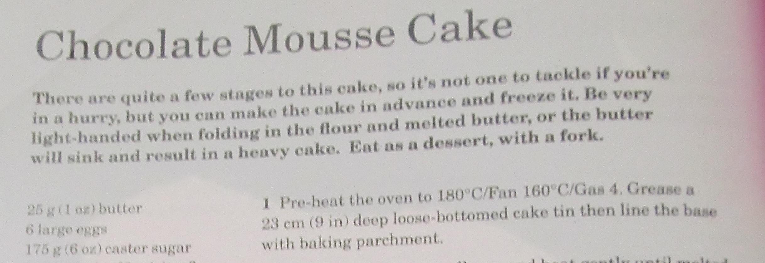 I began with Mary’s chocolate mousse cake and had read the rising to the berry blog to see how this had gone for Annalise – my inspiration for doing this challenge. I read her blog carefully and set off.