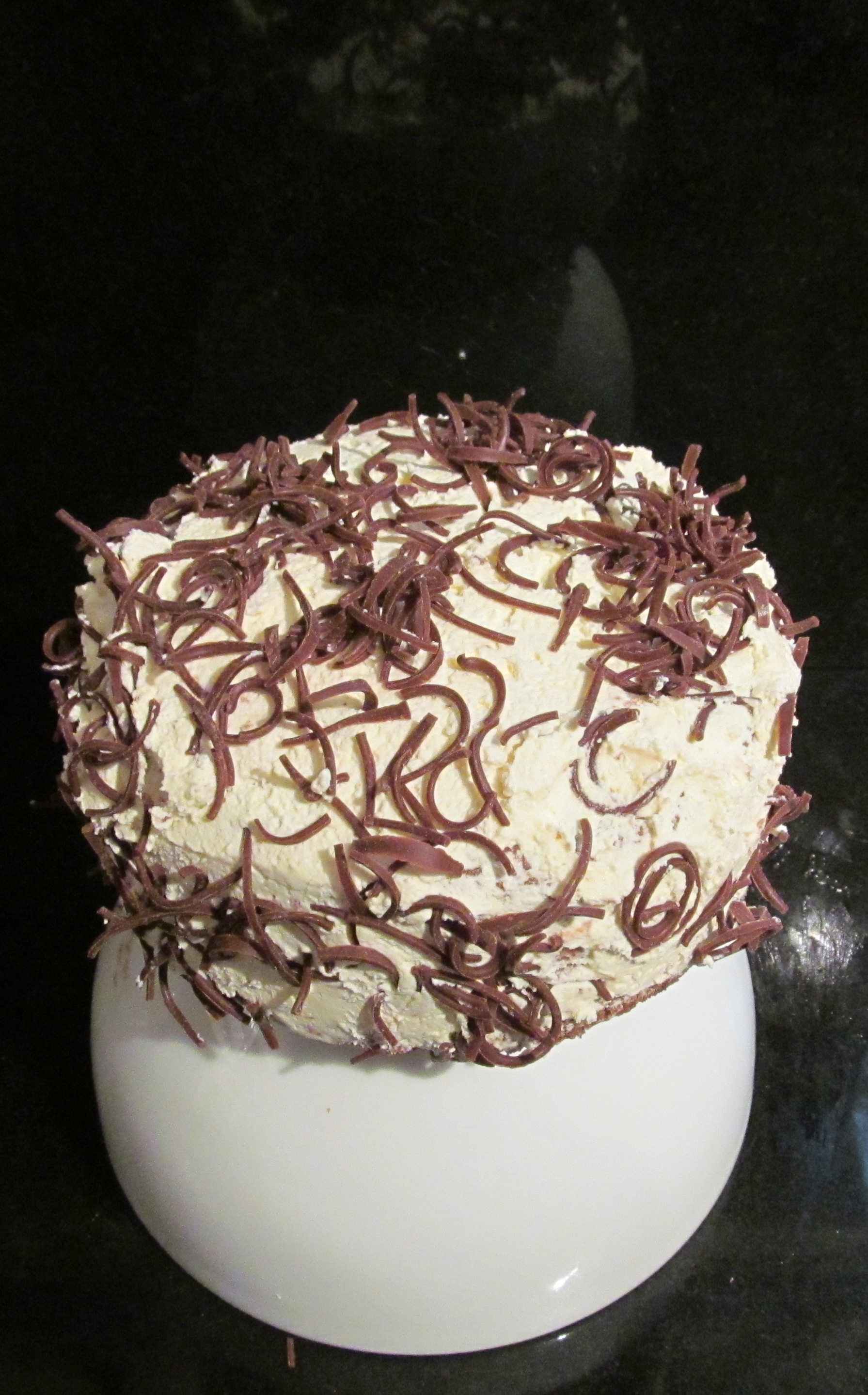 The next morning I removed the cakes from their tins and the mousse was solid. I whipped some cream to cover the cakes and decorated with chocolate curls.