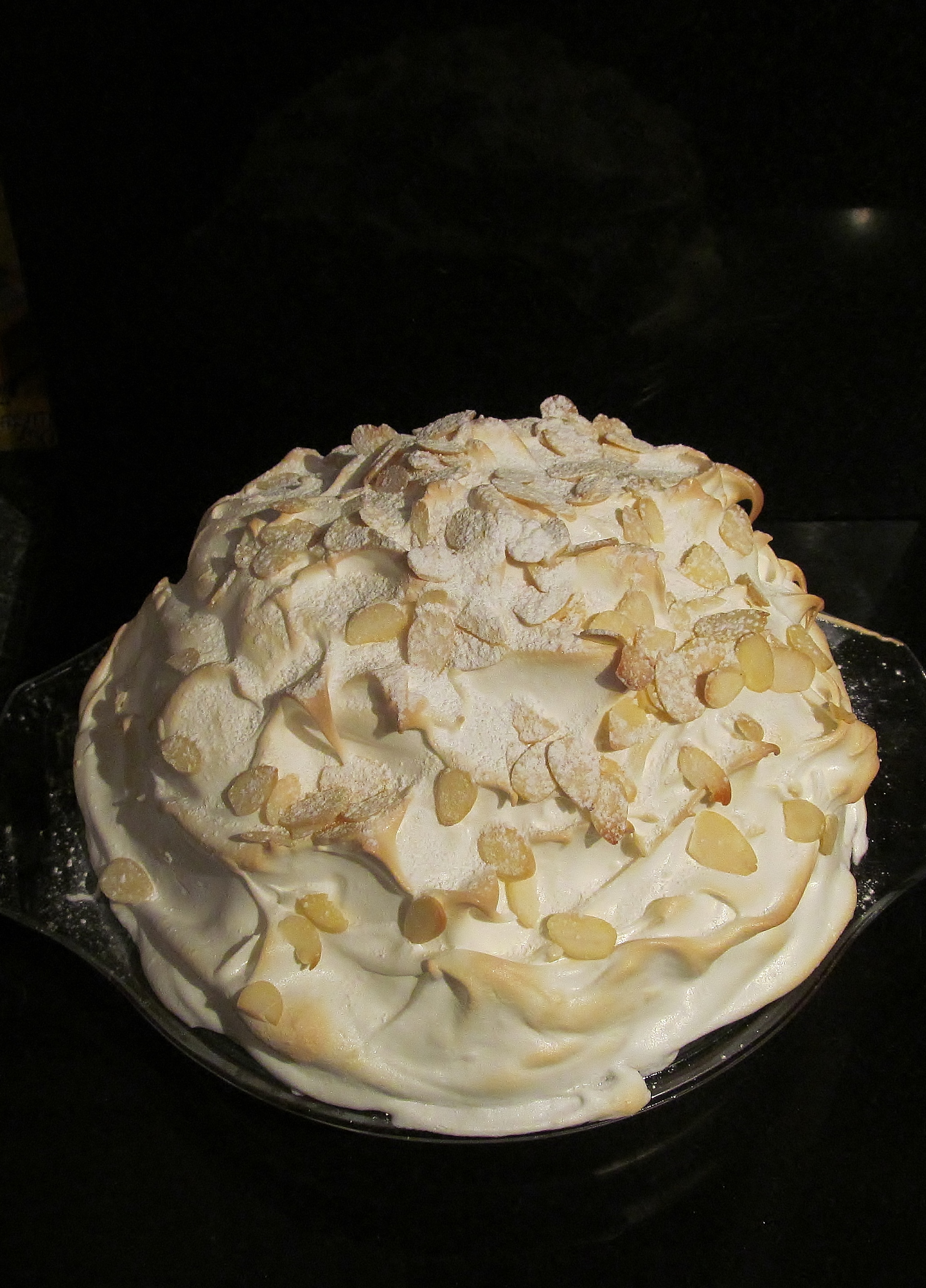 After a few hours, I began to prepare the meringue by whisking the egg whites until stiff then began the tedious task of adding the sugar a little at a time until the meringue was thick and glossy. i got my base out of the freezer, smothered the meringue all over it , sprinkled it with some flaked almonds and put it in the pre-heated oven for 4 minutes. I must say, i was amazed with the result and had the chief tasters on standby with their pudding bowls to collect their part. We ate half of this between us and thoroughly enjoyed it but now feel full and a bit icky!