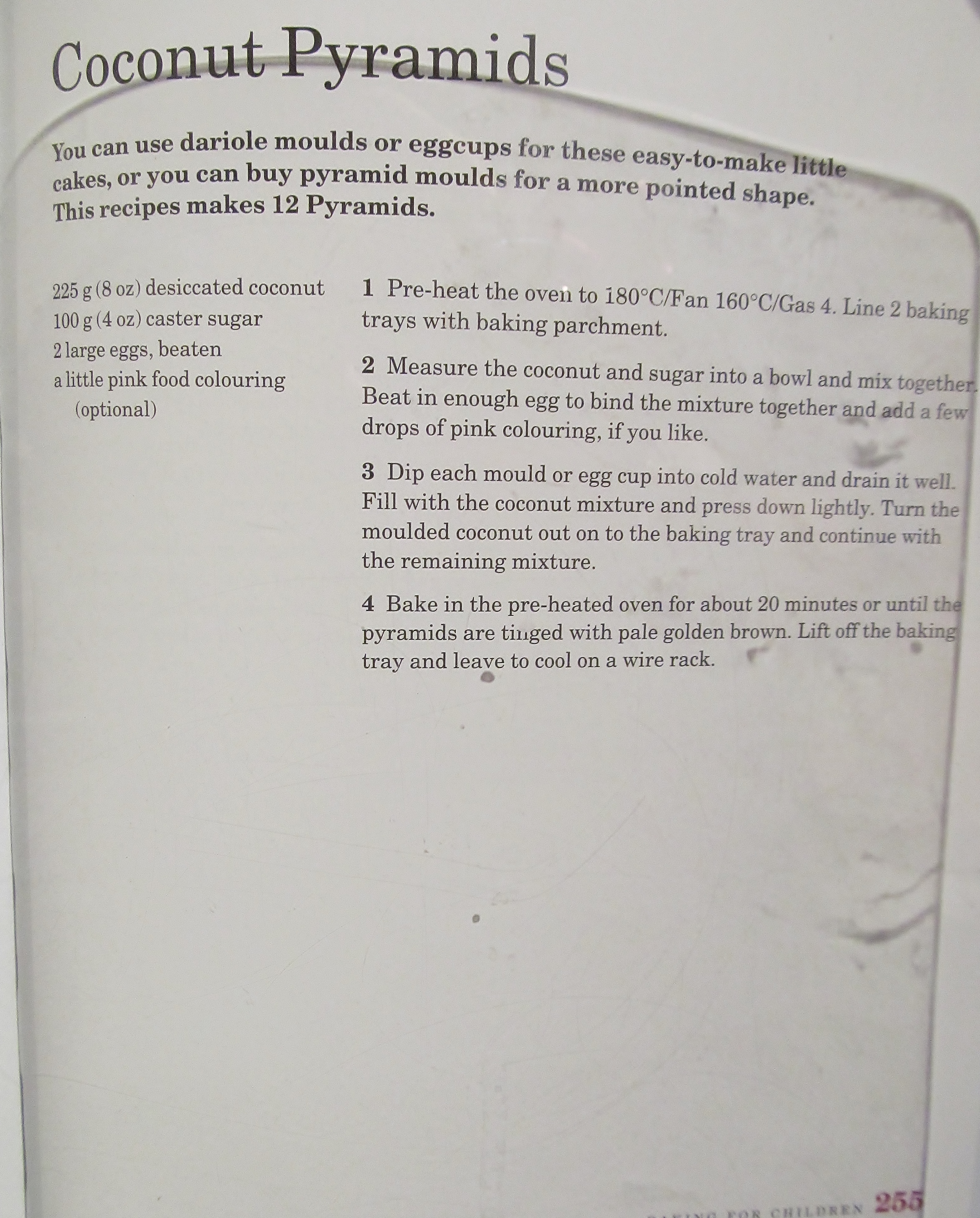 Week fifty three and I am back on form after last weekend and thought I would try two recipes again this week. The first, Mary Berry‘s coconut pyramids was a very simple recipe from her children’s part of her Baking Bible. The recipe was the usual throw everything together mix which Mary is famous for and add some pink food colouring. Mary asks you to spoon the mixture into a dariole mould, press down gently, and then turn out onto a lined baking tray, repeat until the mixture is used up. The colour was quite eye catching!