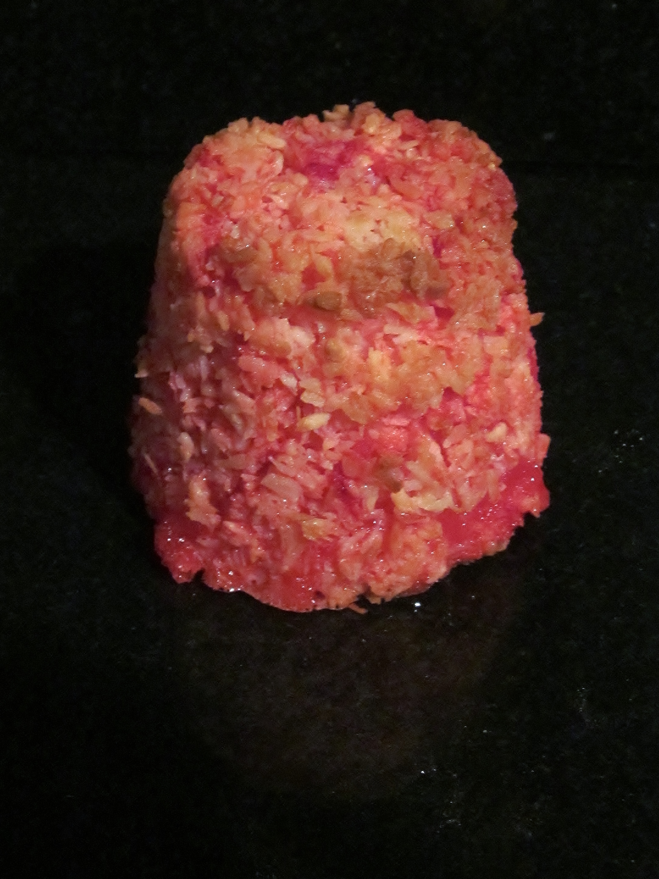 I put the coconut pyramids into the oven and set the timer. When it pinged, I had these umm interesting bright pink coconut towers! I must say though that they taste better than they look!