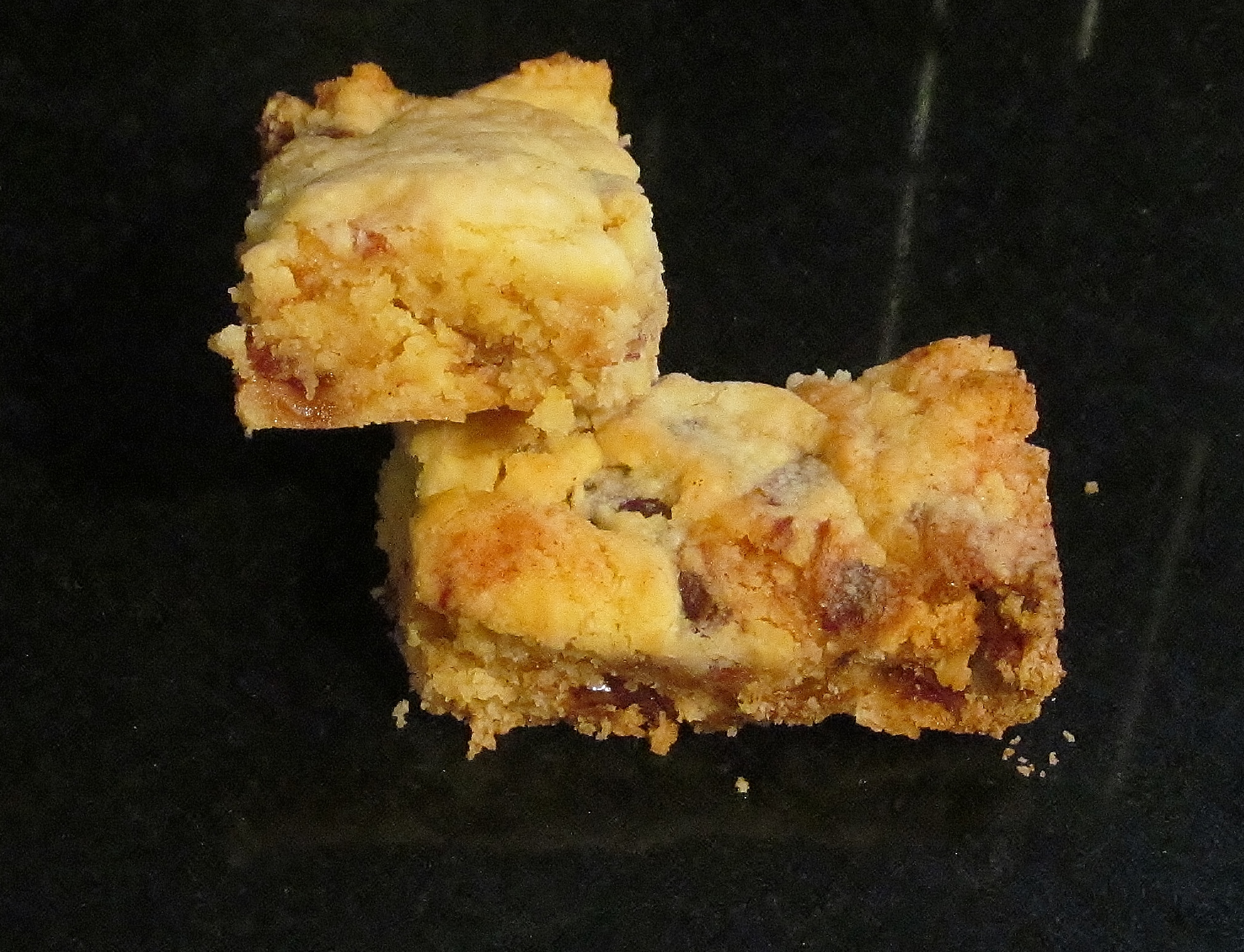 Mary asks you to rub the butter into the flour to make breadcrumb like texture, then add the chopped cherries and dates, some caster sugar and an egg. Bring it all together into a dough like ball and press it into a tray bake tin. Place it in a pre warmed oven for about 10 minutes. After 10 minutes, mark it into bars with a sharp knife and return it to the oven for another 10 minutes or until the bars are a lovely golden colour. Score through the bars again and allow to cool in the tin.