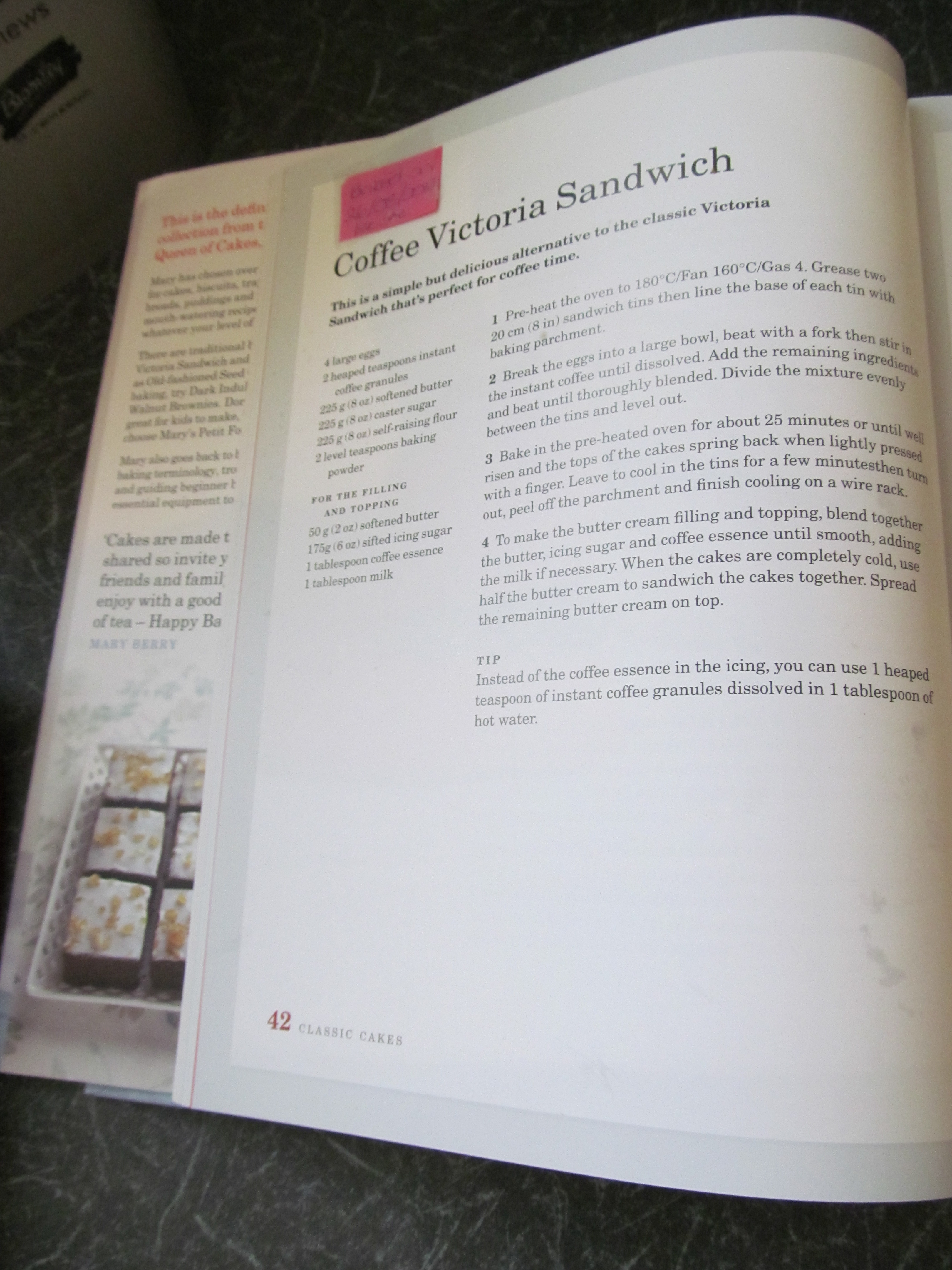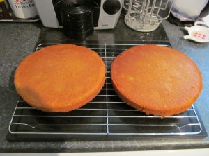 The second bake I made midweek on a day off, while having a new carpet laid in the lounge. It all sounded so easy, go to shop, order carpet, ensure room is empty…hold on, where do we put all the furniture-borrow groundsheets from chief taster, move most furniture into the garage and place on groundsheets, take up old carpet and underlay and notice that the paintwork and walls all need wiping. Spend the baking day wiping paintwork down and waiting for the call from the fitters. I read Mary’s recipe which says to mark circles on grease proof paper, make the cake mix and spread onto the circles and bake in batches.
