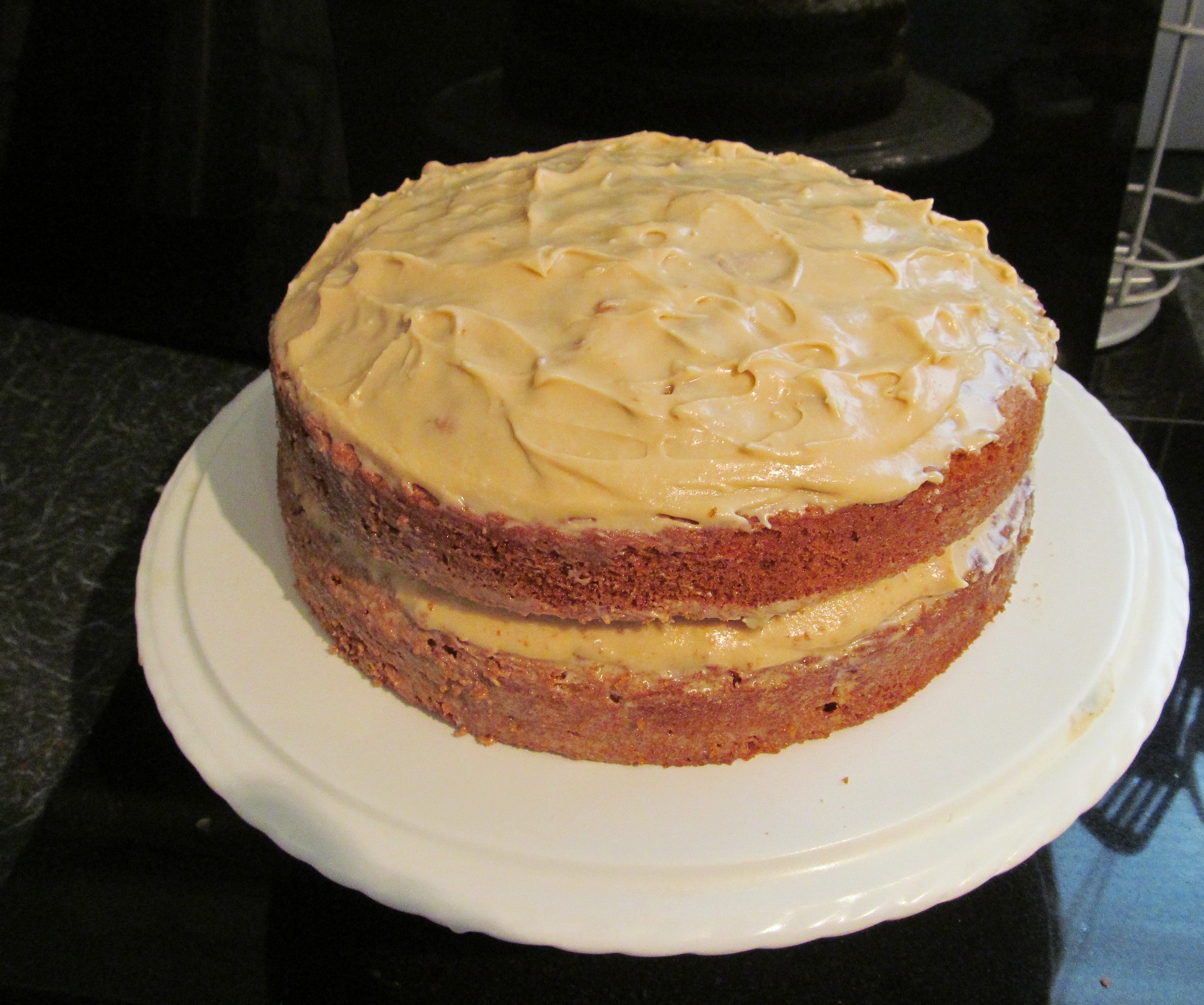 Take a few hours off work the next day, put the cake together- sandwich the 5 sponge layers with butter cream, spread butter cream around the sides and roll in the caramel that you are supposed to crush with a rolling pin from the day before- slight problem, caramel too sticky, won’t crush. Hubby makes a batch, sets well but tastes burnt so plan C- grated chocolate. Sides suitably covered, decorate the top of the cake with the caramel covered sponge cut into slices. finish with a swirl of butter cream and give to the chief tasters for their 49th wedding anniversary! PHEW….