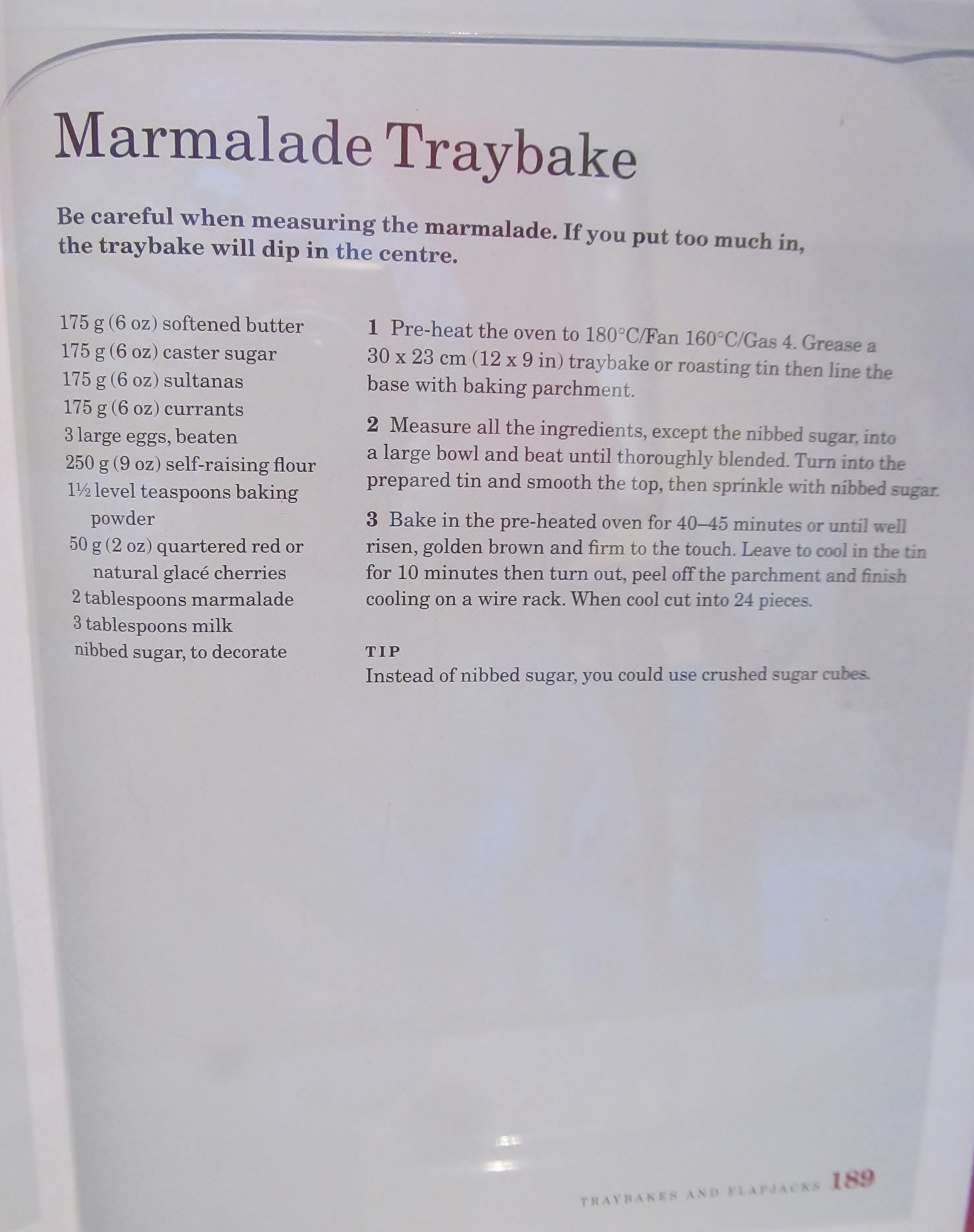Well I am definitely back in the baking saddle this week, I was raring to go this morning and delved eagerly into Mary Berry’s Baking Bible to find 2 bakes that I could fit in today. I do like the tray bake section- have I mentioned that I am still recycling my Lakeland foil tray bake tins?! Well Mary’s recipe for the marmalade tray bake is a “no brainer”- throw all the ingredients into the bowl and mix. The only thing she warns you about is measuring the marmalade carefully as too much will make the tray bake sink in the middle.