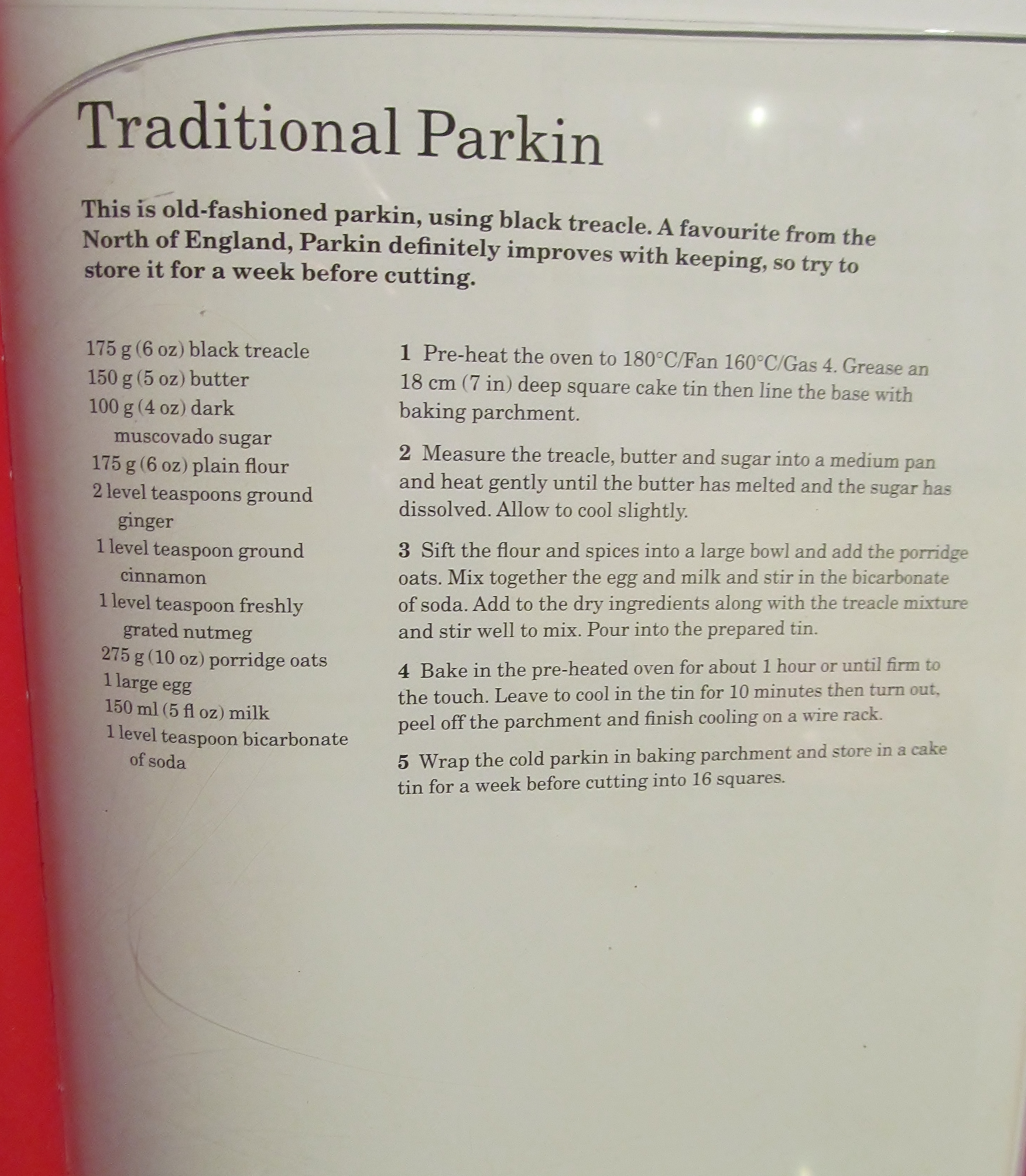 I found a few variations of it’s “history” but little seems to be known about where it started other than- “Parkin is a traditional gingerbread eaten in Autumn, in Yorkshire. It is a sweet and sticky cake that is perfect for long winter evenings. Often associated with NorthYorkshire, particularly the Leeds and York regions, the origins of parkin are not known. It is also baked in other Northern regions such as Lancashire. Parkin is a moist and sticky cake which is traditionally eaten on Bonfire Night, but can be eaten all year round. Guy Fawkes was born in Yorkshire, and this tasty gingerbread, which originated in that area, is traditionally baked in November to celebrate the foiling of his plan to blow up the Houses of Parliament!The principal ingredients of parkin are white flour, oats, black treacle or molasses, butter and ginger. All these ingredients were important constituents of Northern, working-class diet in the late 18th and early 19th centuries, so it is likely that parkin evolved in that period. It is a cheap and filling cake that is distinguishable for its dark colour and lovely rich consistency.”
