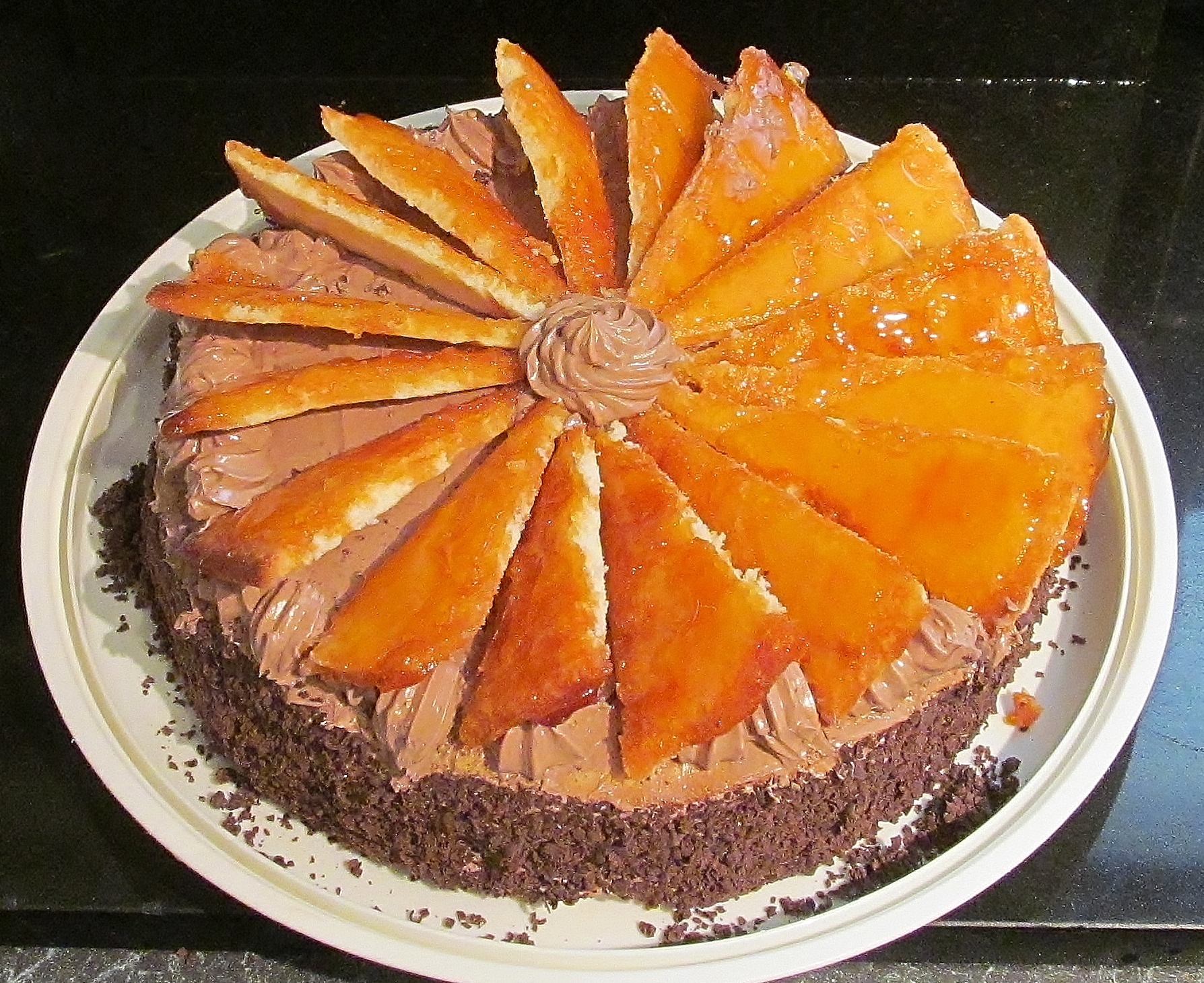 Next step was to tackle the icing. This is where the “death” bit comes in. Mary asks you to melt 450 g or 1 lb of dark chocolate! I have said before that I really am not a fan of dark chocolate but most of my tasters are so I compromised with 3/4 dark chocolate and 1/4 milk chocolate to try and take the bitterness of the dark chocolate away. Once the chocolate has been melted, Mary then asks you to add the 200g of butter to it and allow it to melt into the chocolate…… ( cholesterol comes to mind….lol) . Mary then asks you to sandwich each layer of the cake together with this icing and then stand the cake on a wire rack and use the rest of the icing over the top and sides of the cake! I gave it a liberal covering but still had some icing left over. Mary asks you to leave it to set then decorate with coarsely grated plain and white chocolate. I must admit I ” cheated” here by buying a pot of ready mixed chocolate curls!