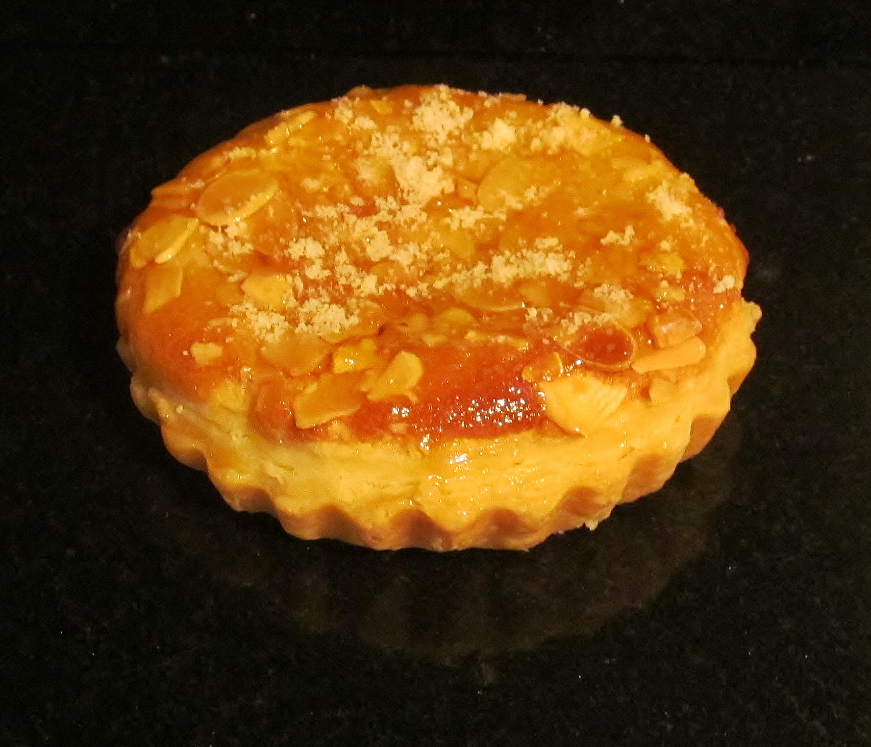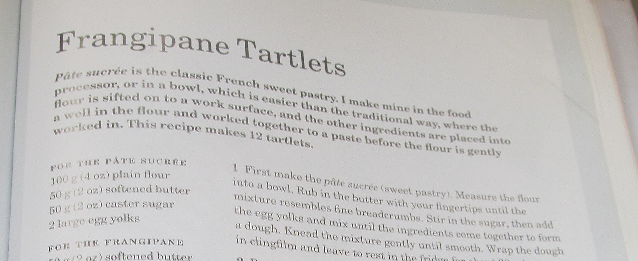 The second recipe was Mary’s frangipane tartlets. I followed Mary’s instructions about making the pastry carefully, lined the mini tartlet tins ad put them in the fridge to chill while I made the frangipane filling. I had decided to make four slightly larger tarts rather than the 12 tiny ones that Mary says her recipe will make. Once the frangipane filling was made, I filled the tart cases and put them in the oven to bake one I had sprinkled flaked almonds on the top.